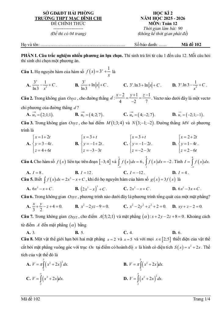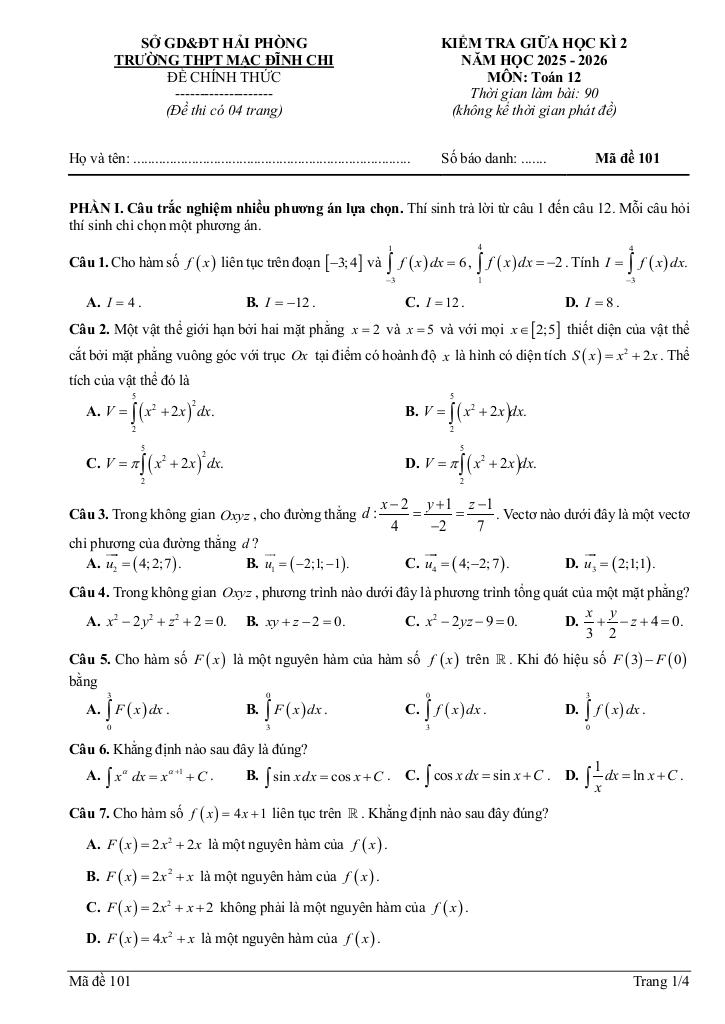 Trích dẫn Đề giữa học kì 2 Toán 12 năm 2025 – 2026 trường THPT Mạc Đĩnh Chi – Hải Phòng: