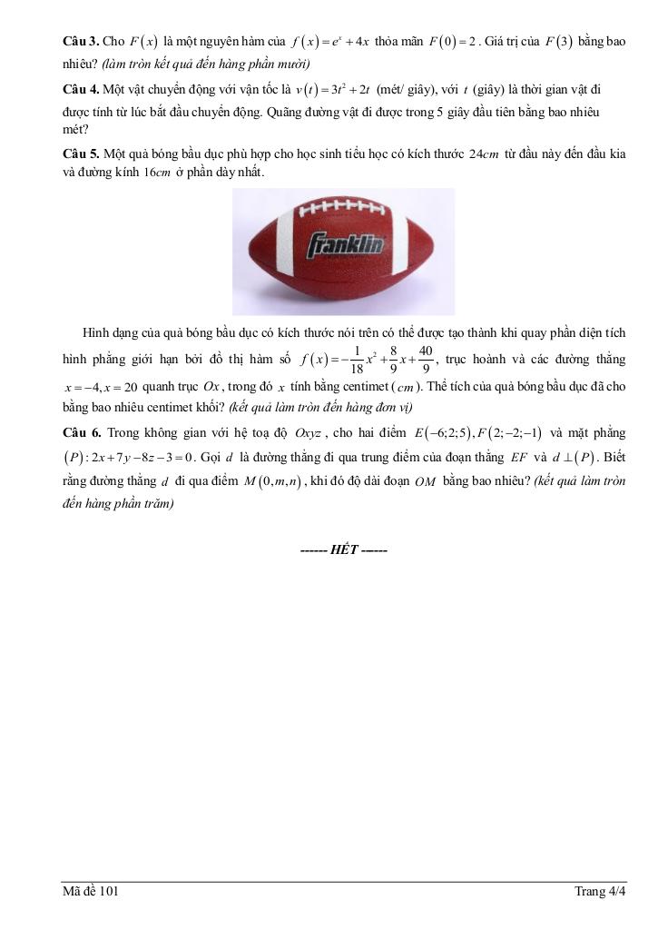 + Một quả bóng bầu dục phù hợp cho học sinh tiểu học có kích thước 24cm từ đầu này đến đầu kia và đường kính 16cm ở phần dày nhất. Hình dạng của quả bóng bầu dục có kích thước nói trên có thể được tạo thành khi quay phần diện tích hình phẳng giới hạn bởi đồ thị hàm số f(x) = -1/18×2 + 8/9x + 40/9, trục hoành và các đường thẳng x = -4, x = 20 quanh trục Ox, trong đó x tính bằng centimet (cm). Thể tích của quả bóng bầu dục đã cho bằng bao nhiêu centimet khối? (kết quả làm tròn đến hàng đơn vị).
