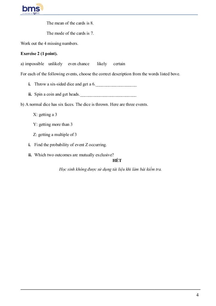Trích dẫn Đề giữa học kì 2 Toán 6 năm 2024 – 2025 trường Ban Mai School – Hà Nội: