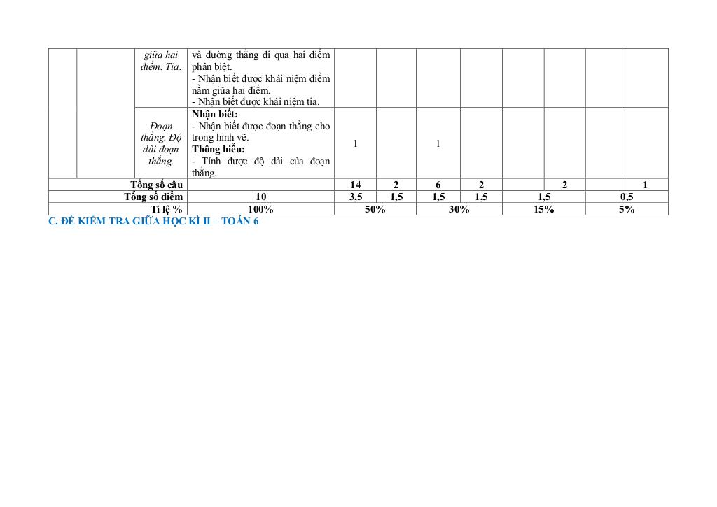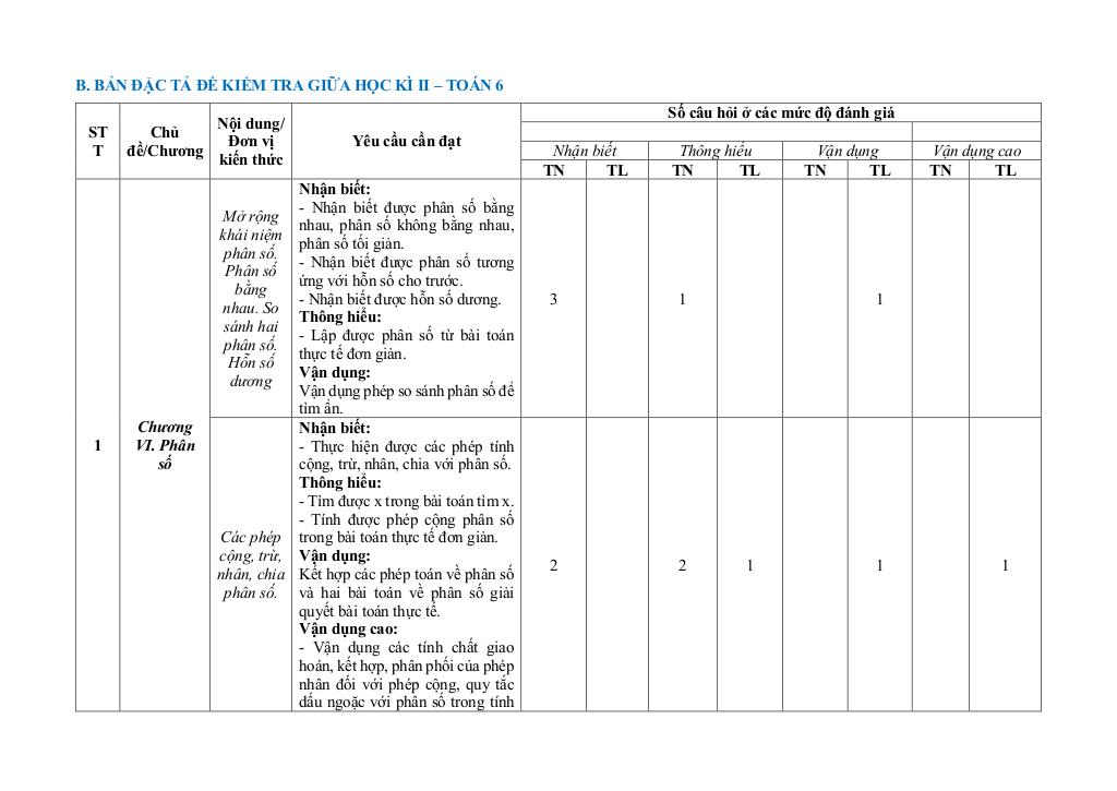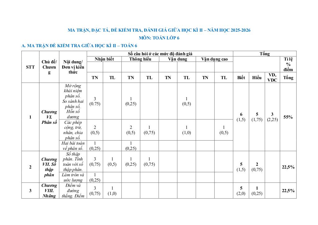 Ma trận Đề giữa học kì 2 Toán 6 năm 2025 – 2026 trường THCS Đồi Ngô – Bắc Ninh: