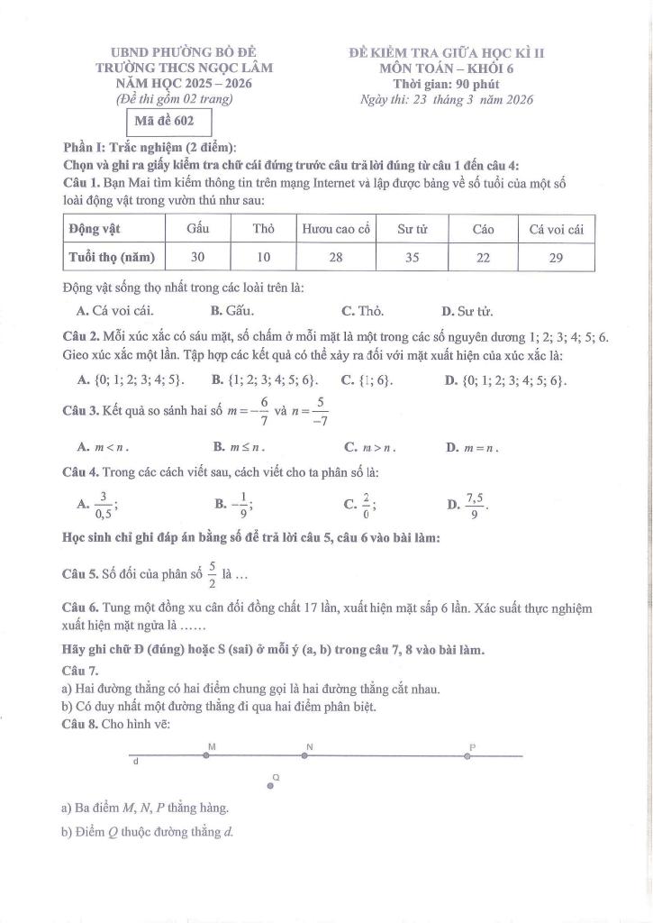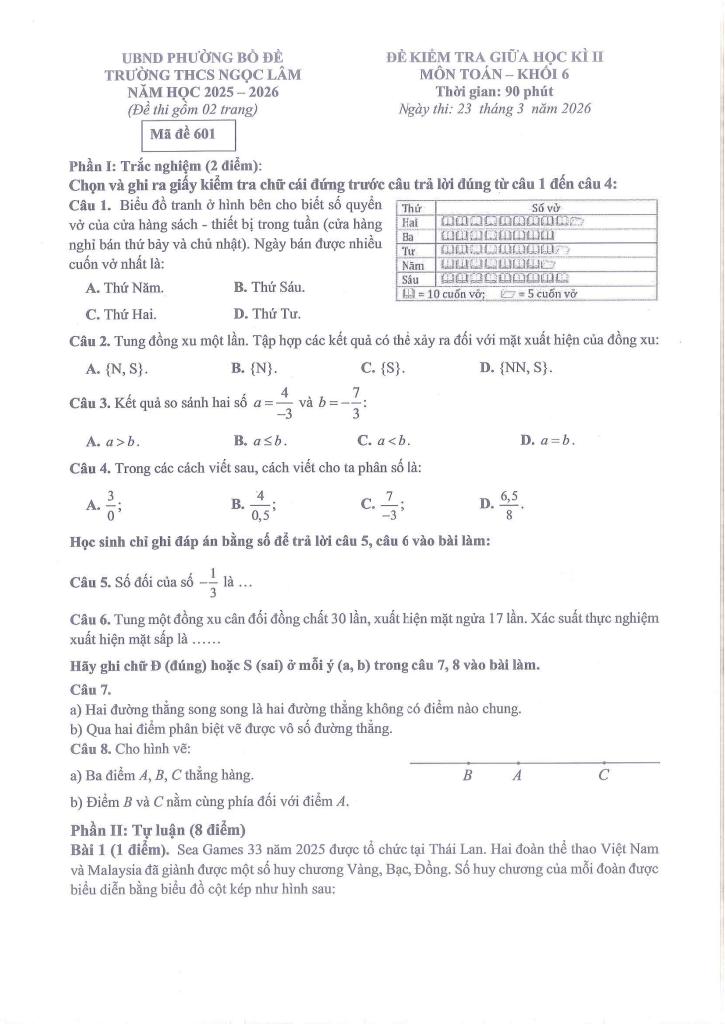 Trích dẫn Đề giữa học kì 2 Toán 6 năm 2025 – 2026 trường THCS Ngọc Lâm – Hà Nội: