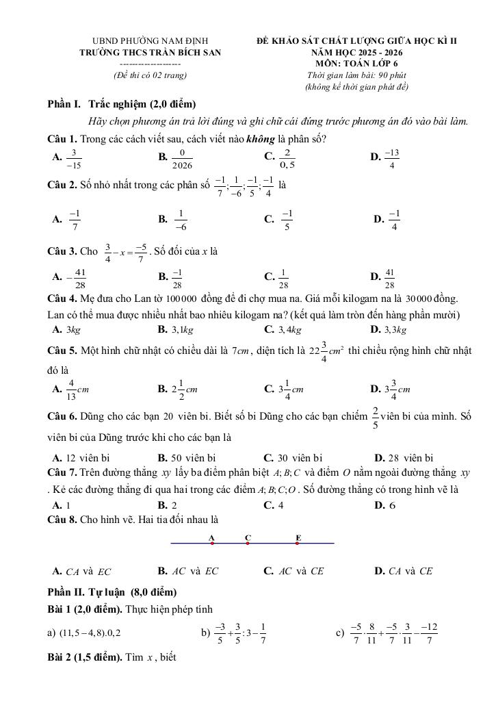 Trích dẫn Đề giữa học kì 2 Toán 6 năm 2025 – 2026 trường THCS Trần Bích San – Ninh Bình: