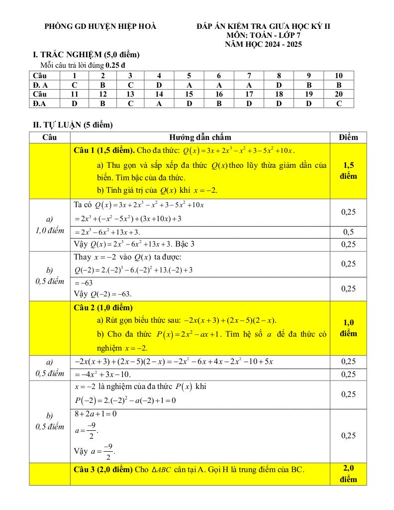 giaitoan.edu.vn giới thiệu đến quý thầy, cô giáo và các em học sinh lớp 7 đề kiểm tra chất lượng giữa học kì 2 môn Toán 7 năm học 2024 – 2025 phòng Giáo dục và Đào tạo huyện Hiệp Hòa, tỉnh Bắc Giang. Đề thi có đáp án chi tiết và hướng dẫn chấm điểm.