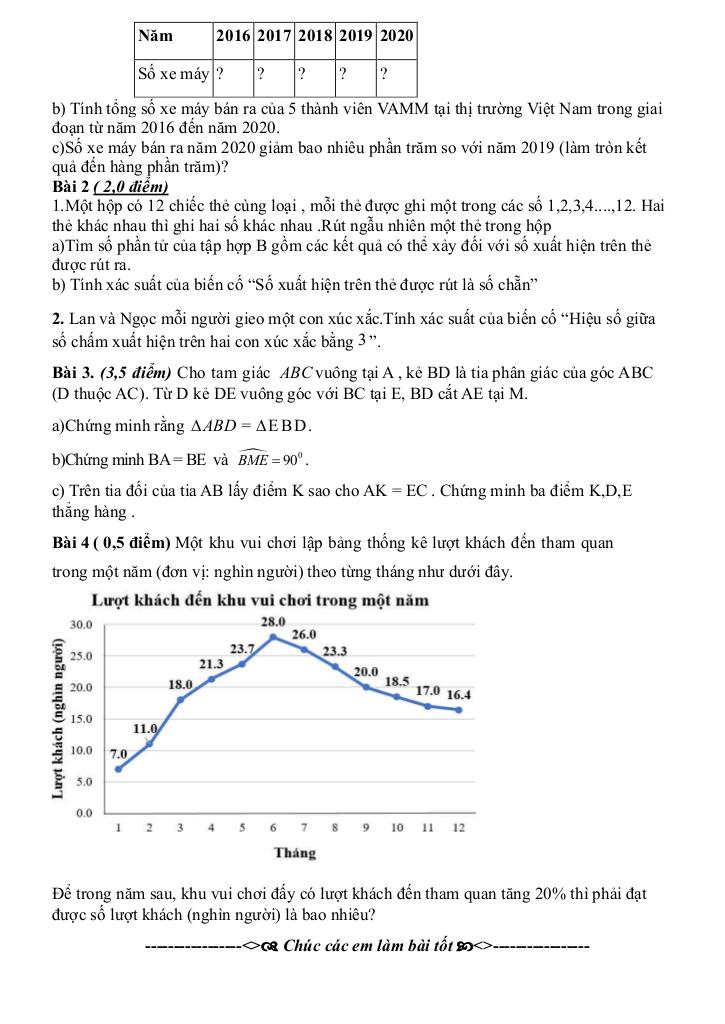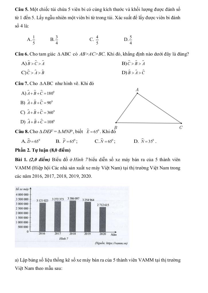 + Biểu đồ ở Hình 7 biểu diễn số xe máy bán ra của 5 thành viên VAMM (Hiệp hội Các nhà sản xuất xe máy Việt Nam) tại thị trường Việt Nam trong các năm 2016, 2017, 2018, 2019, 2020. a) Lập bảng số liệu thống kê số xe máy bán ra của 5 thành viên VAMM tại thị trường Việt Nam theo mẫu sau: Năm: 2016 2017 2018 2019 2020 – Số xe máy. b) Tính tổng số xe máy bán ra của 5 thành viên VAMM tại thị trường Việt Nam trong giai đoạn từ năm 2016 đến năm 2020. c) Số xe máy bán ra năm 2020 giảm bao nhiêu phần trăm so với năm 2019 (làm tròn kết quả đến hàng phần trăm)?