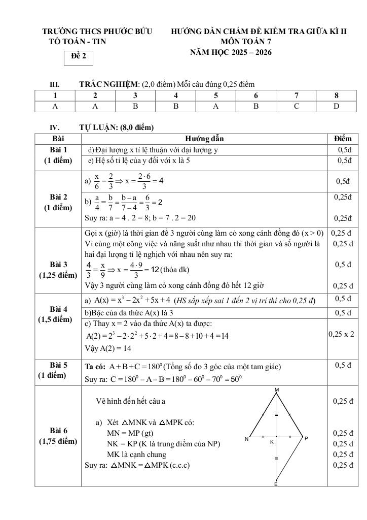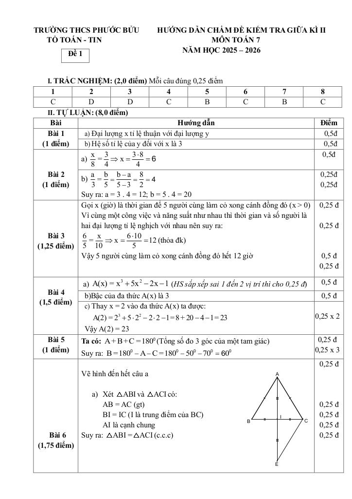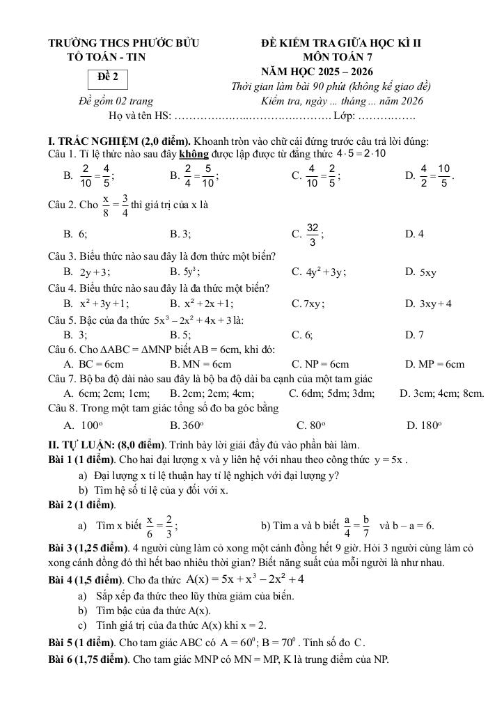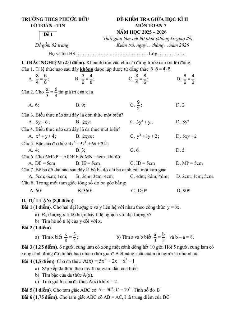 Toán học luôn là một môn học quan trọng, giúp học sinh phát triển tư duy logic và kỹ năng giải quyết vấn đề. Để hỗ trợ các bạn học sinh và giáo viên trong việc học tập và giảng dạy, bài viết này sẽ cung cấp lời giải chi tiết và đáp án chính xác cho chủ đề đề giữa học kì 2 toán 7 năm 2025 – 2026 trường thcs phước bửu – tp hcm, giúp bạn hiểu sâu và tự tin hơn khi làm bài tập.