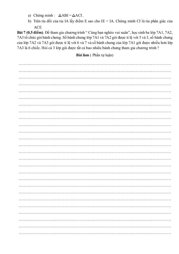 + Để tham gia chương trình “Cùng bạn nghèo vui xuân”, học sinh ba lớp 7A1, 7A2, 7A3 tổ chức gói bánh chưng. Số bánh chưng lớp 7A1 và 7A2 gói được tỉ lệ với 5 và 3, số bánh chưng của lớp 7A2 và 7A3 gói được tỉ lệ với 6 và 7 và số bánh chưng của lớp 7A1 gói được nhiều hơn lớp 7A3 là 6 chiếc. Hỏi cả 3 lớp gói được tất cả bao nhiêu bánh chưng tham gia chương trình?