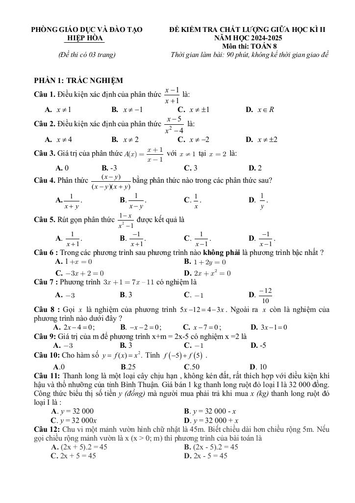 Trích dẫn Đề giữa học kì 2 Toán 8 năm 2024 – 2025 phòng GD&ĐT Hiệp Hòa – Bắc Giang: