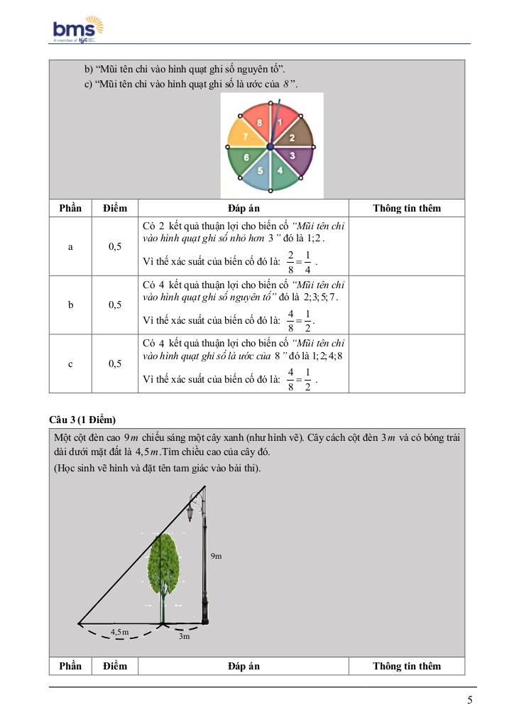+ Một cột đèn cao 9m chiếu sáng một cây xanh (như hình vẽ). Cây cách cột đèn 3m và có bóng trải dài dưới mặt đất là 4,5m. Tìm chiều cao của cây đó. (Học sinh vẽ hình và đặt tên tam giác vào bài thi).