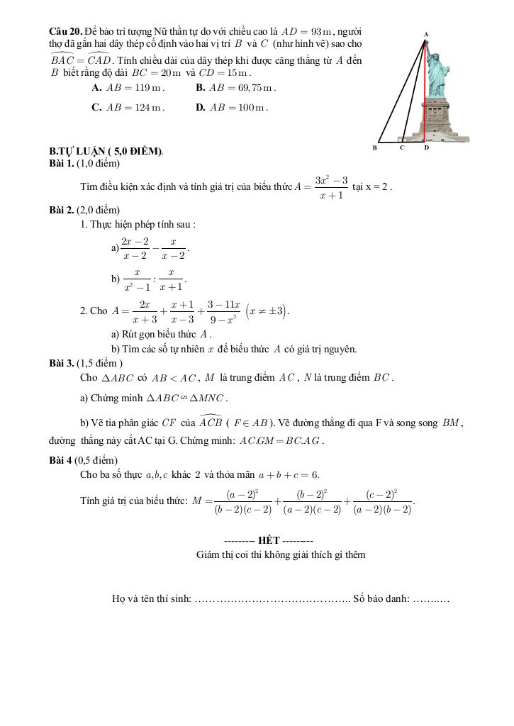 + Để bảo trì tượng Nữ thần tự do với chiều cao là AD = 93m, người thợ đã gắn hai dây thép cố định vào hai vị trí B và C (như hình vẽ) sao cho BAC = CAD. Tính chiều dài của dây thép khi được căng thẳng từ A đến B biết rằng độ dài BC = 20m và CD = 15m.