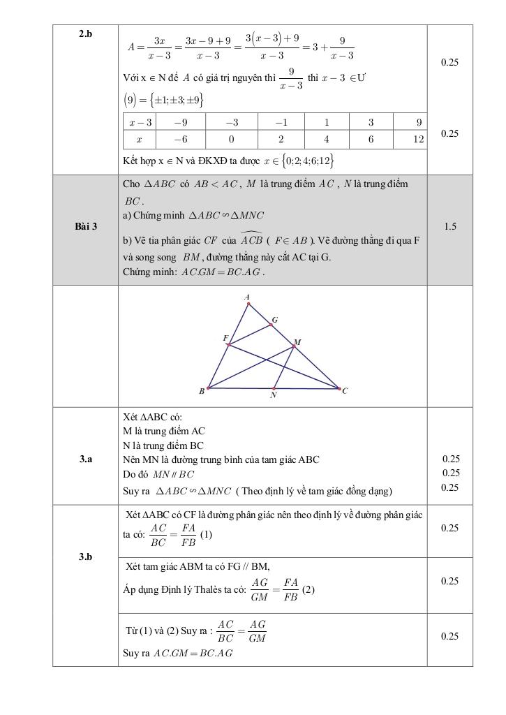 + Cho tam giác ABC có AB < AC, M là trung điểm AC, N là trung điểm BC. a) Chứng minh tam giác ABC đồng dạng tam giác MNC. b) Vẽ tia phân giác CF của góc ACB (F thuộc AB). Vẽ đường thẳng đi qua F và song song BM, đường thẳng này cắt AC tại G. Chứng minh: giaitoan.edu.vn = giaitoan.edu.vn.