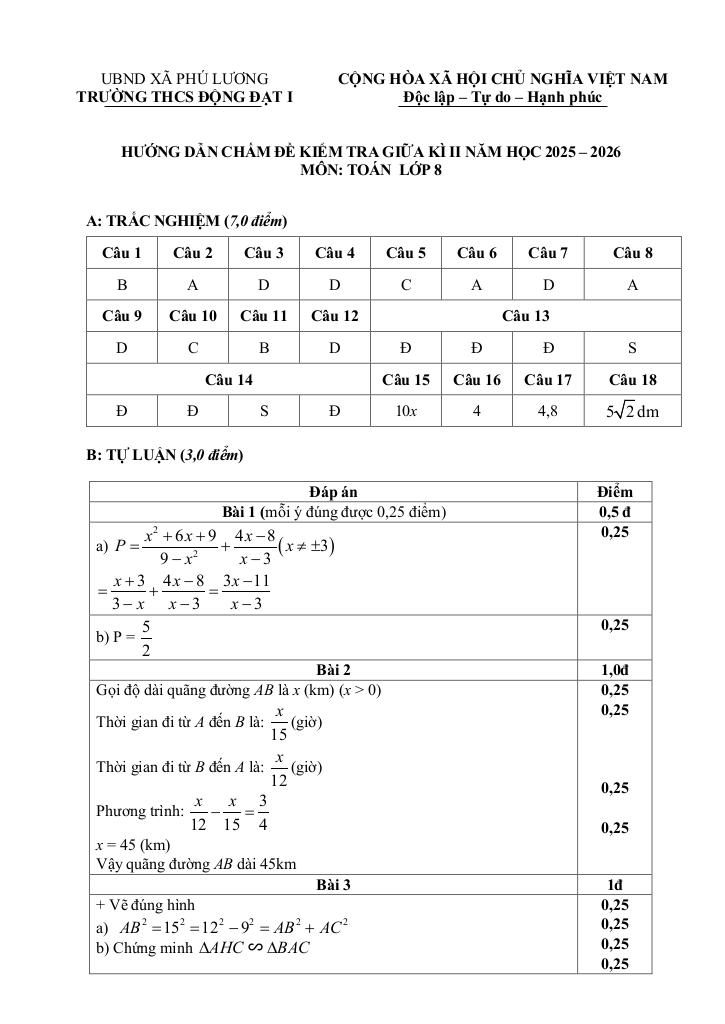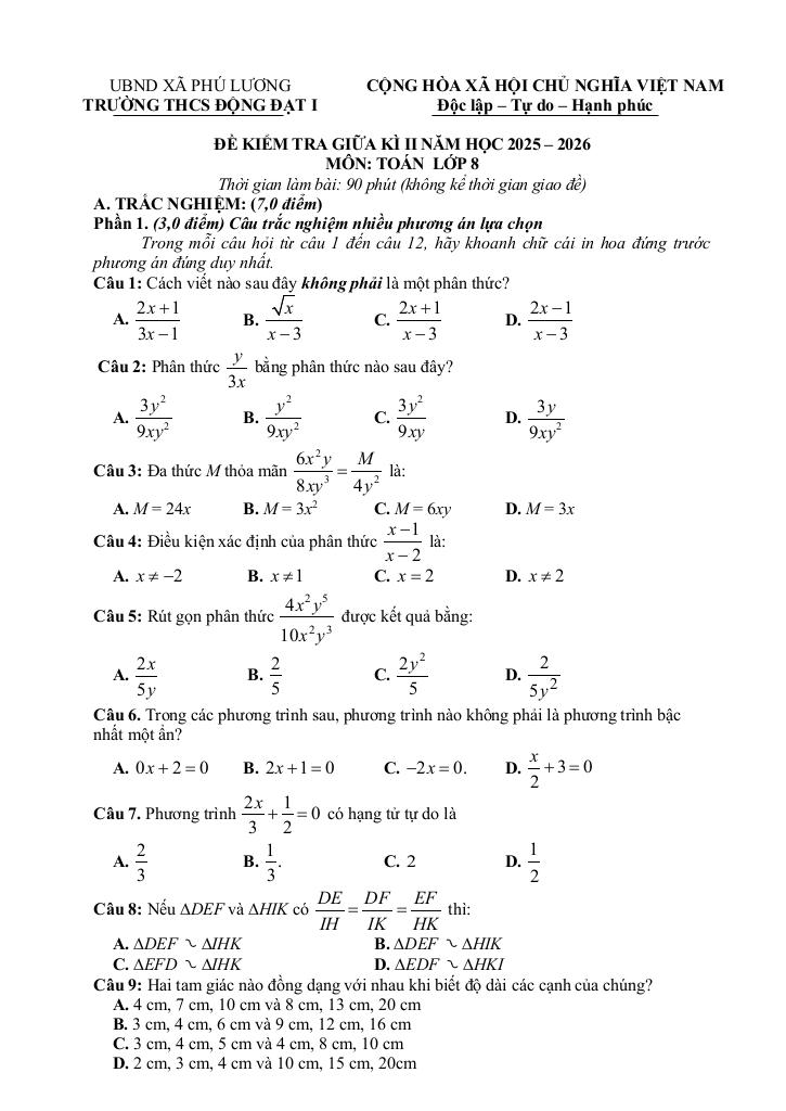 Toán học luôn là một môn học quan trọng, giúp học sinh phát triển tư duy logic và kỹ năng giải quyết vấn đề. Để hỗ trợ các bạn học sinh và giáo viên trong việc học tập và giảng dạy, bài viết này sẽ cung cấp lời giải chi tiết và đáp án chính xác cho chủ đề đề giữa học kì 2 toán 8 năm 2025 – 2026 trường thcs động đạt 1 – thái nguyên, giúp bạn hiểu sâu và tự tin hơn khi làm bài tập.