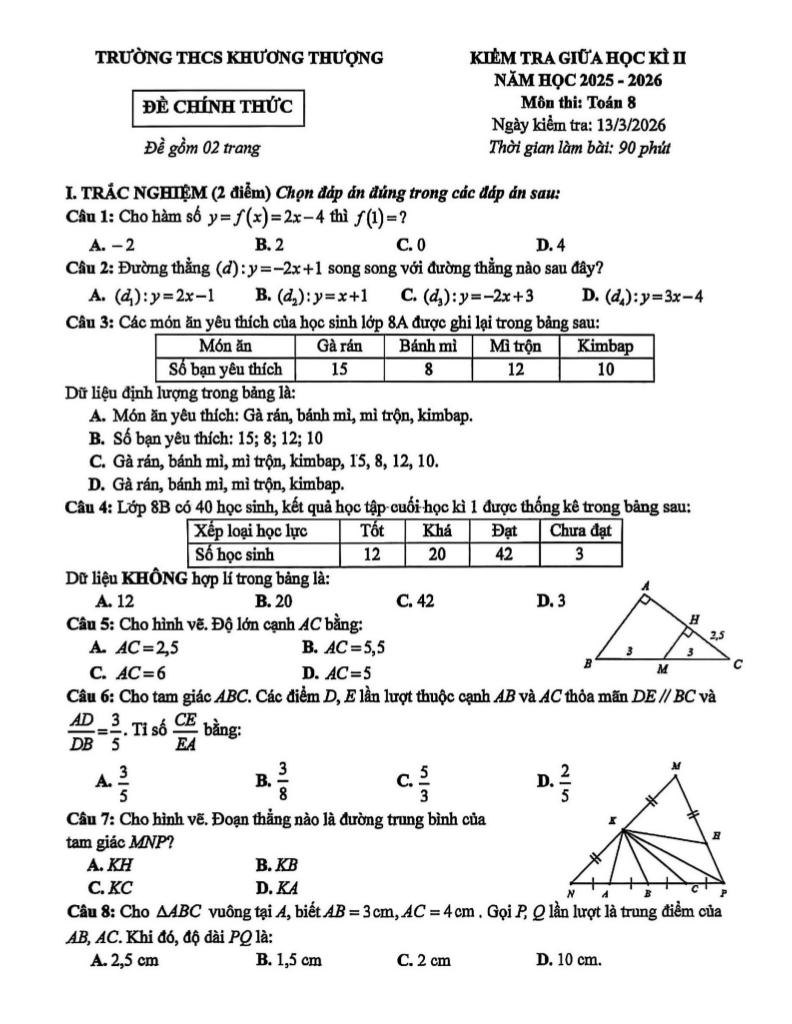 giaitoan.edu.vn giới thiệu đến quý thầy, cô giáo và các em học sinh đề kiểm tra giữa học kì 2 môn Toán 8 năm học 2025 – 2026 trường THCS Khương Thượng, thành phố Hà Nội. Kỳ thi được diễn ra vào ngày 13 tháng 03 năm 2026.