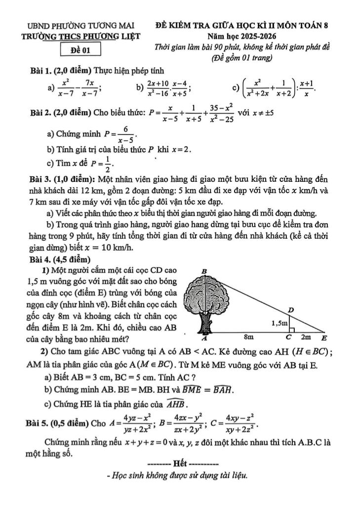 Trích dẫn Đề giữa học kì 2 Toán 8 năm 2025 – 2026 trường THCS Phương Liệt – Hà Nội: