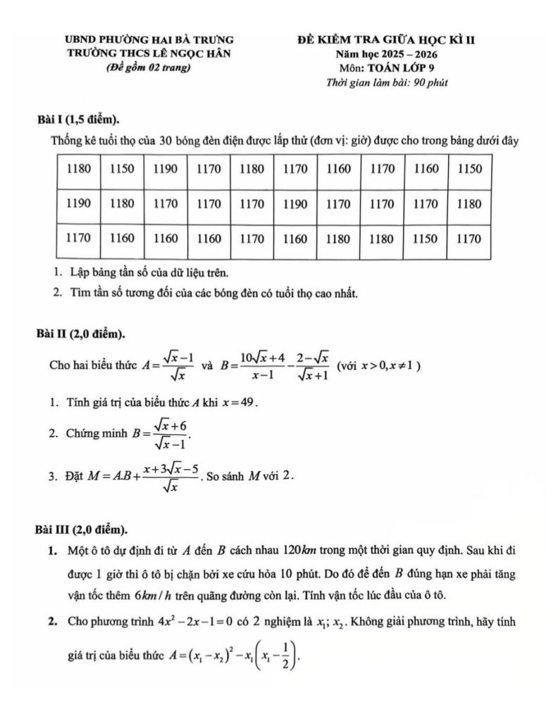 Trích dẫn Đề giữa học kì 2 Toán 9 năm 2025 – 2026 trường THCS Lê Ngọc Hân – Hà Nội: