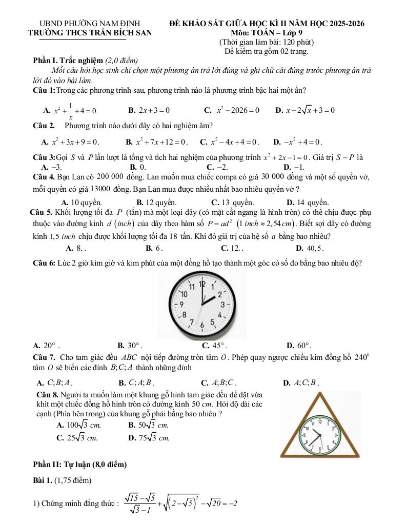 Trích dẫn Đề giữa học kì 2 Toán 9 năm 2025 – 2026 trường THCS Trần Bích San – Ninh Bình: