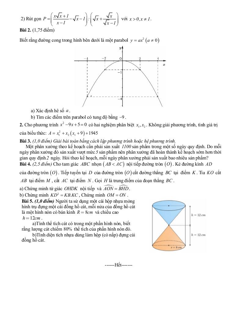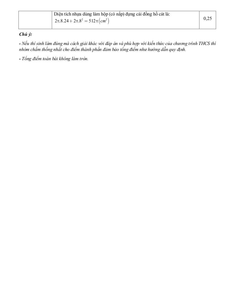 + Người ta sử dụng một cái hộp nhựa mỏng hình trụ đựng một cái đồng hồ cát, mỗi nửa của đồng hồ cát là một hình nón có bán kính R = 8cm và chiều cao h = 12cm. a)Tính thể tích cát có trong một phần hình nón, biết rằng lượng cát chiếm 80% thể tích của phần hình nón đó. b)Tính diện tích nhựa dùng làm hộp (có nắp) đựng cái đồng hồ cát.