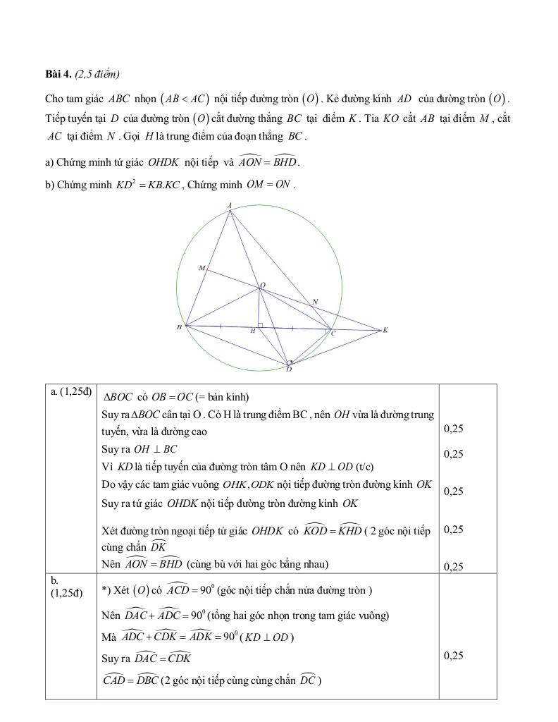 + Cho tam giác ABC nhọn (AB < AC) nội tiếp đường tròn (O). Kẻ đường kính AD của đường tròn (O). Tiếp tuyến tại D của đường tròn (O) cắt đường thẳng BC tại điểm K. Tia KO cắt AB tại điểm M, cắt AC tại điểm N. Gọi H là trung điểm của đoạn thẳng BC. a) Chứng minh tứ giác OHDK nội tiếp và AON = BHD. b) Chứng minh KD2 = giaitoan.edu.vn. Chứng minh OM = ON.