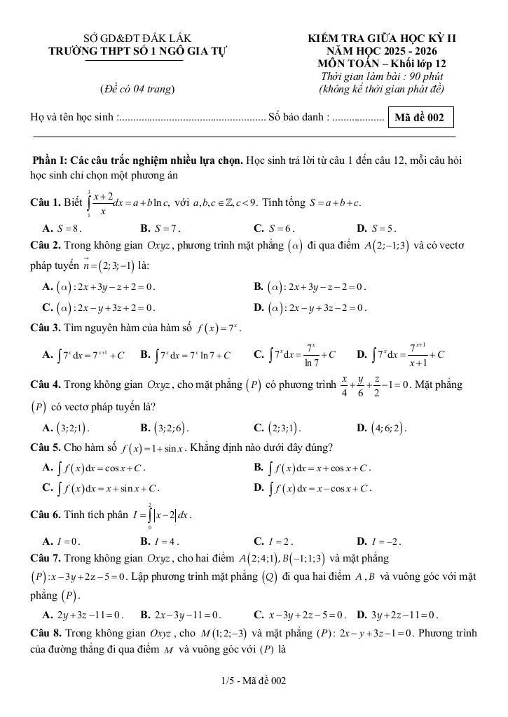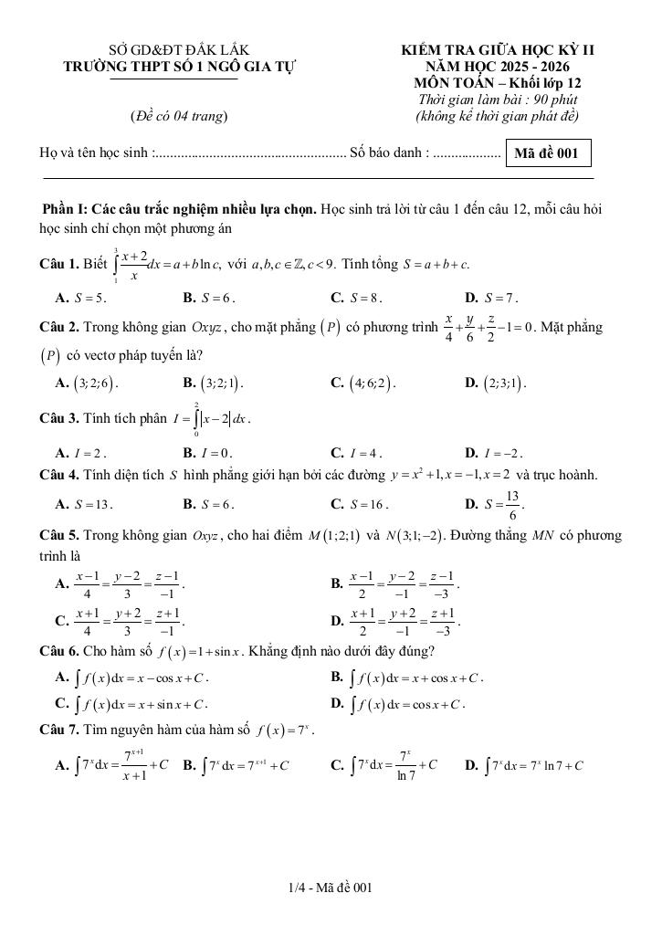 Trích dẫn Đề giữa học kỳ 2 Toán 12 năm 2025 – 2026 trường THPT Ngô Gia Tự 1 – Đắk Lắk: