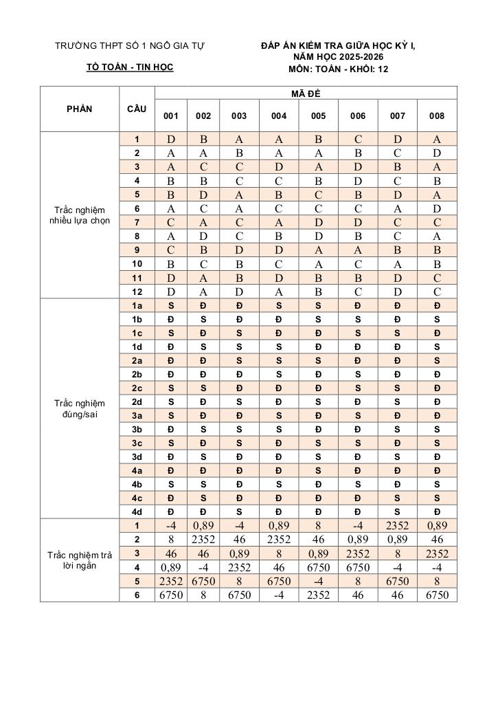 giaitoan.edu.vn giới thiệu đến quý thầy, cô giáo và các em học sinh đề kiểm tra giữa học kỳ 2 môn Toán 12 năm học 2025 – 2026 trường THPT Ngô Gia Tự số 1, tỉnh Đắk Lắk. Đề thi có đáp án mã đề 001 002 003 004 005 006 007 008.