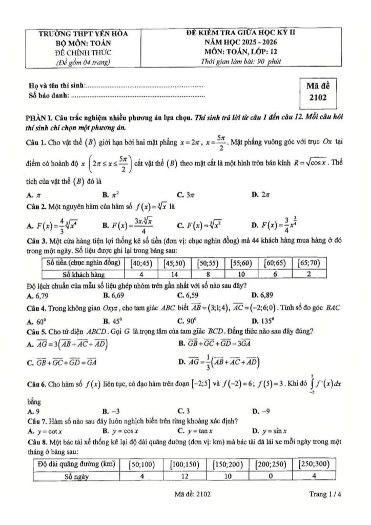 Giải Toán đề giữa học kỳ 2 toán 12 năm 2025 – 2026 trường thpt yên hòa – hà nội với Đáp Án Mới Nhất