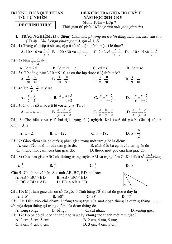 Trích dẫn Đề giữa học kỳ 2 Toán 7 năm 2024 – 2025 trường THCS Quế Thuận – Quảng Nam:
