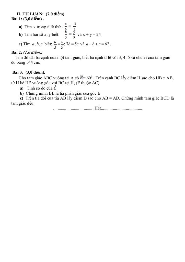 + Tìm độ dài ba cạnh của một tam giác, biết ba cạnh tỉ lệ với 3; 4; 5 và chu vi của tam giác đó bằng 144 cm.
