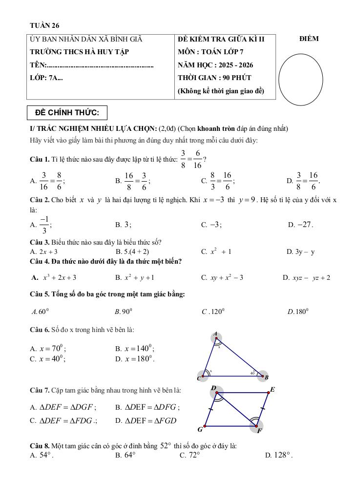 Toán học luôn là một môn học quan trọng, giúp học sinh phát triển tư duy logic và kỹ năng giải quyết vấn đề. Để hỗ trợ các bạn học sinh và giáo viên trong việc học tập và giảng dạy, bài viết này sẽ cung cấp lời giải chi tiết và đáp án chính xác cho chủ đề đề giữa học kỳ 2 toán 7 năm 2025 – 2026 trường thcs hà huy tập – tp hcm, giúp bạn hiểu sâu và tự tin hơn khi làm bài tập.