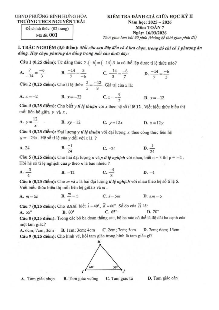 Giải Toán đề giữa học kỳ 2 toán 7 năm 2025 – 2026 trường thcs nguyễn trãi – tp hcm với Đáp Án Mới Nhất