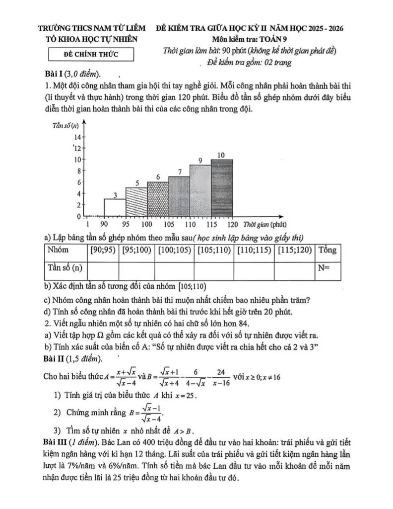 Trích dẫn Đề giữa học kỳ 2 Toán 9 năm 2025 – 2026 trường THCS Nam Từ Liêm – Hà Nội: