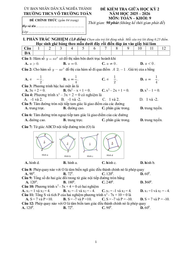 Giải Toán đề giữa học kỳ 2 toán 9 năm 2025 – 2026 trường thcs võ trường toản – tp hcm với Đáp Án Mới Nhất
