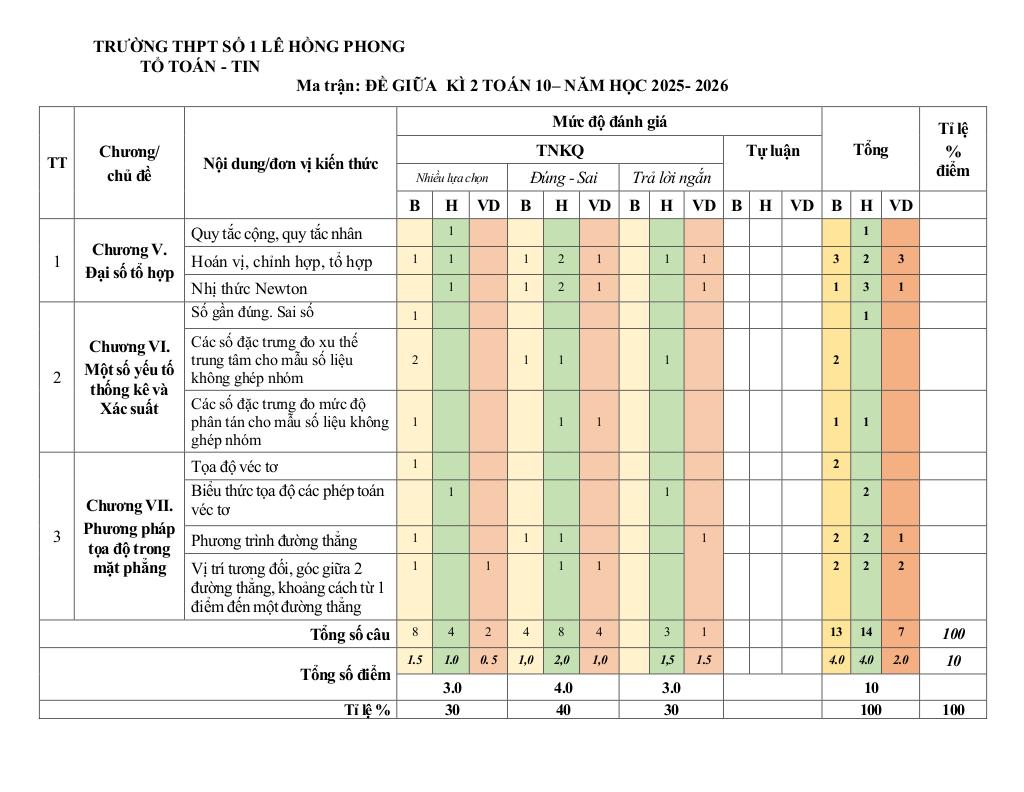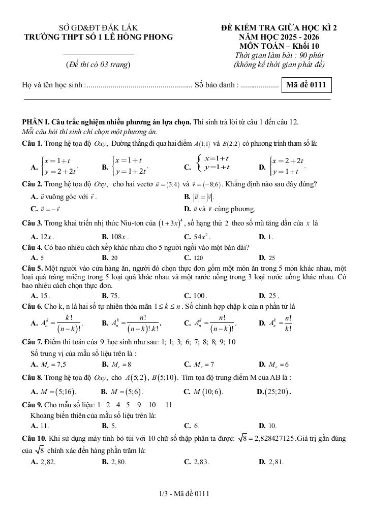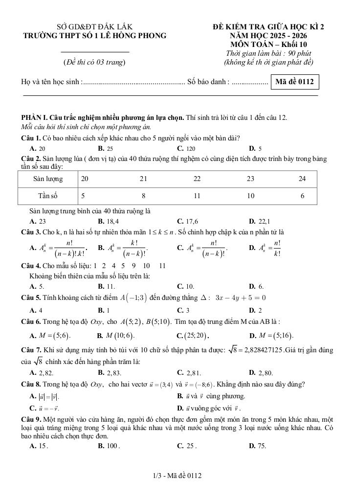 Trích dẫn Đề giữa kì 2 Toán 10 năm 2025 – 2026 trường THPT Lê Hồng Phong 1 – Đắk Lắk: