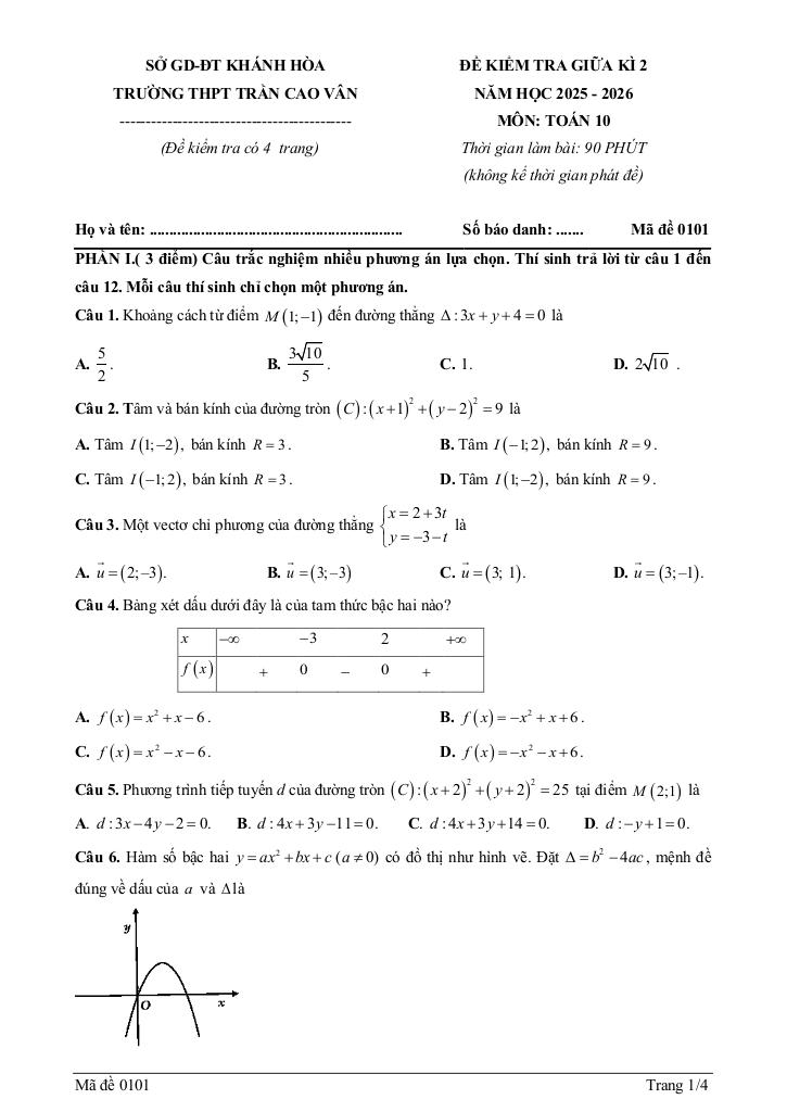Toán học luôn là một môn học quan trọng, giúp học sinh phát triển tư duy logic và kỹ năng giải quyết vấn đề. Để hỗ trợ các bạn học sinh và giáo viên trong việc học tập và giảng dạy, bài viết này sẽ cung cấp lời giải chi tiết và đáp án chính xác cho chủ đề đề giữa kì 2 toán 10 năm 2025 – 2026 trường thpt trần cao vân – khánh hòa, giúp bạn hiểu sâu và tự tin hơn khi làm bài tập.