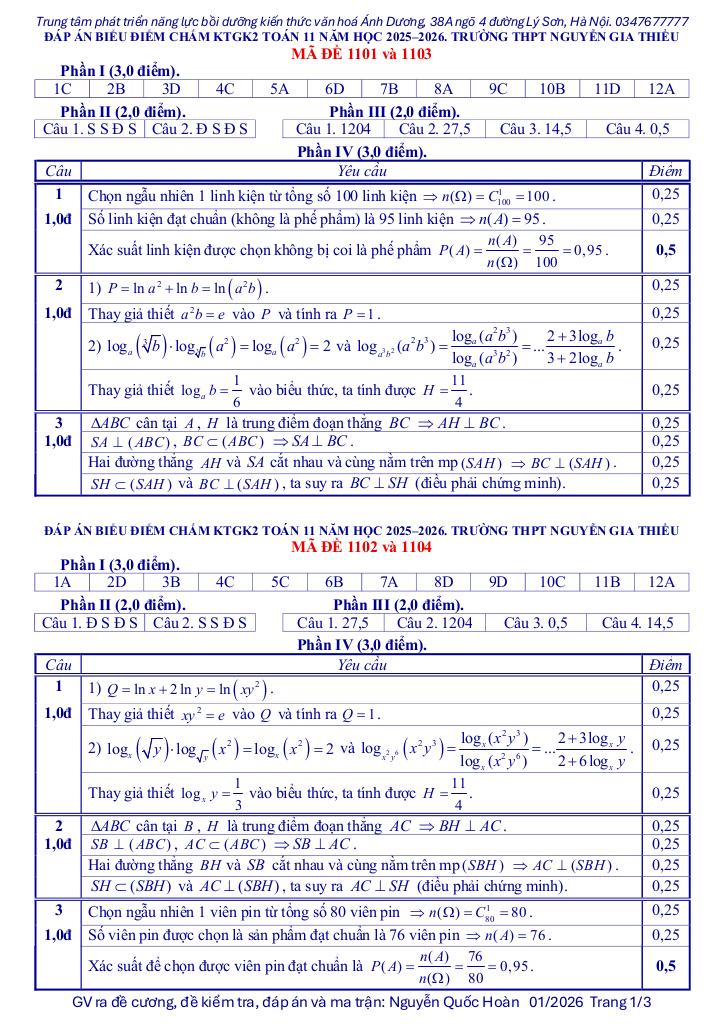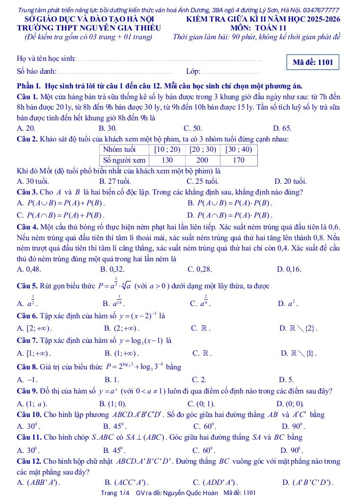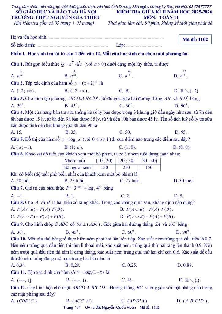 giaitoan.edu.vn giới thiệu đến quý thầy, cô giáo và các em học sinh đề kiểm tra giữa học kì 2 môn Toán 11 năm học 2025 – 2026 trường THPT Nguyễn Gia Thiều, thành phố Hà Nội. Đề thi có đáp án mã đề 1101 1102 1103 1104.