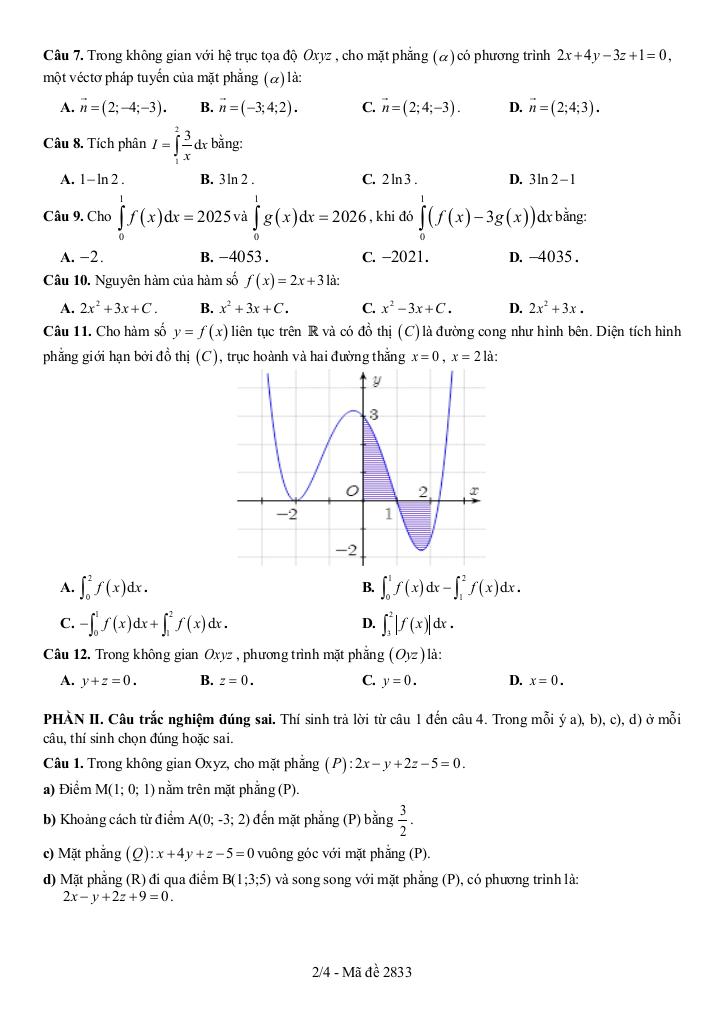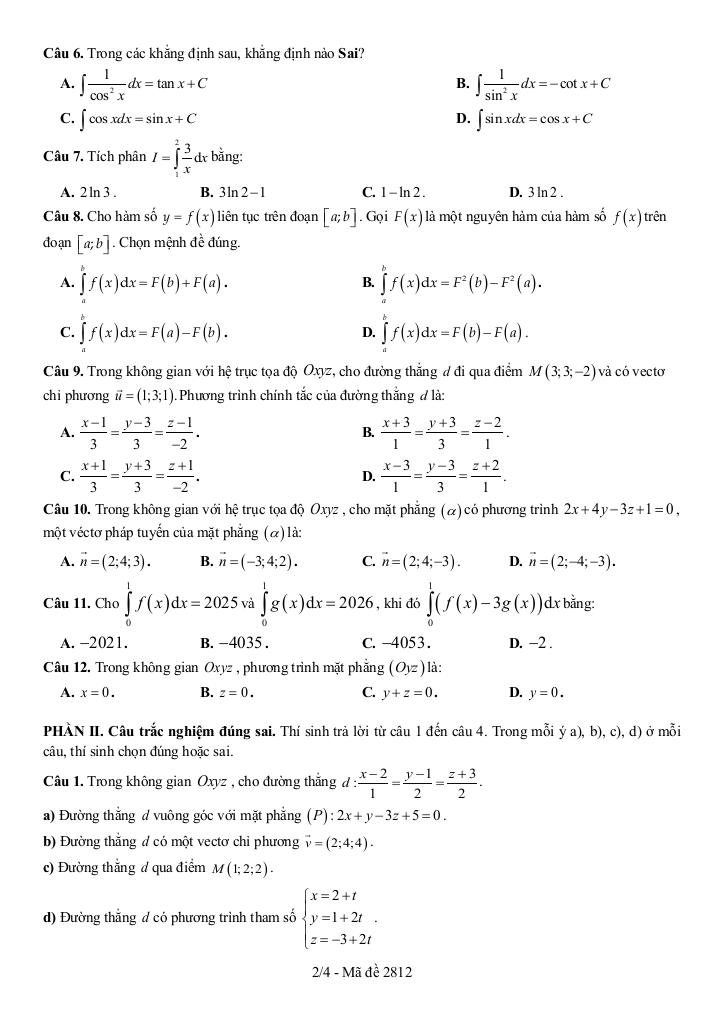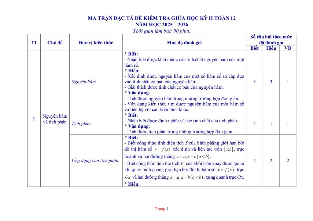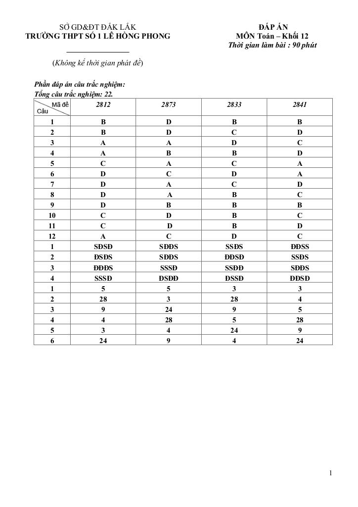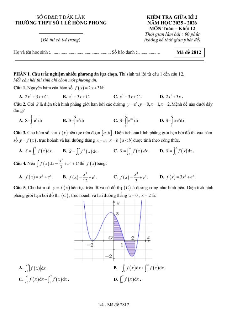Trích dẫn Đề giữa kì 2 Toán 12 năm 2025 – 2026 trường THPT Lê Hồng Phong 1 – Đắk Lắk: