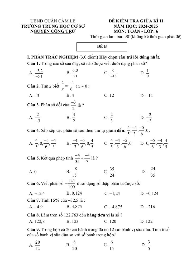Trích dẫn Đề giữa kì 2 Toán 6 năm 2024 – 2025 trường THCS Nguyễn Công Trứ – Đà Nẵng: