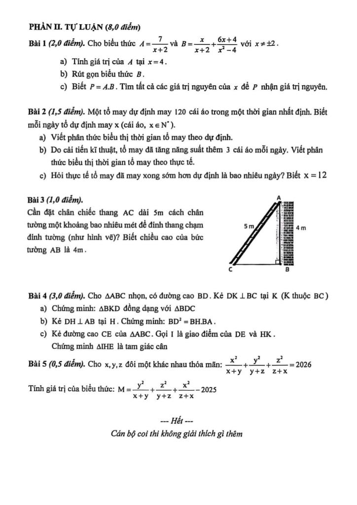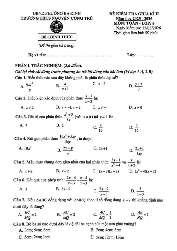 Trích dẫn Đề giữa kì 2 Toán 8 năm 2025 – 2026 trường THCS Nguyễn Công Trứ – Hà Nội: