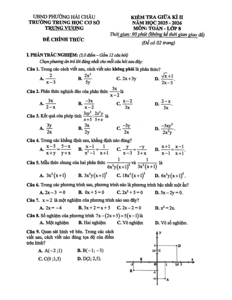 Trích dẫn Đề giữa kì 2 Toán 8 năm 2025 – 2026 trường THCS Trưng Vương – Đà Nẵng: