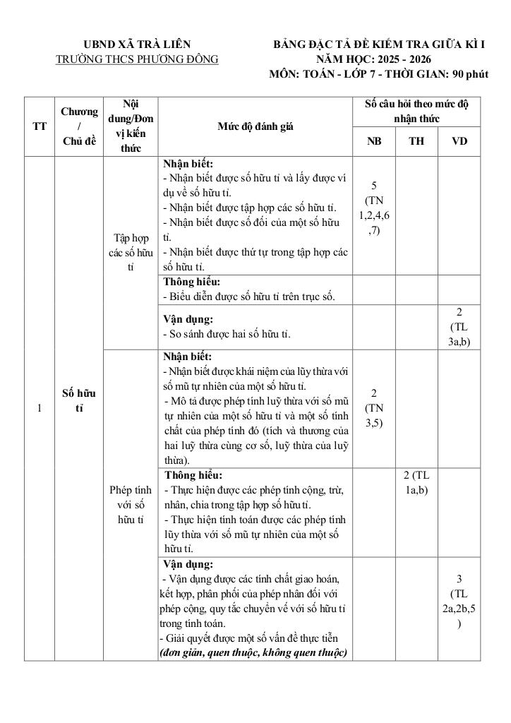 Ma trận Đề giữa kỳ 1 Toán 7 năm 2025 – 2026 trường THCS Phương Đông – Đà Nẵng:
