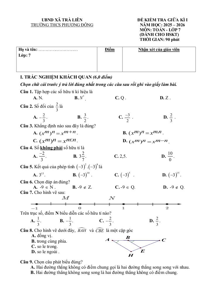 Giải Toán đề giữa kỳ 1 toán 7 năm 2025 – 2026 trường thcs phương đông – đà nẵng với Đáp Án Mới Nhất