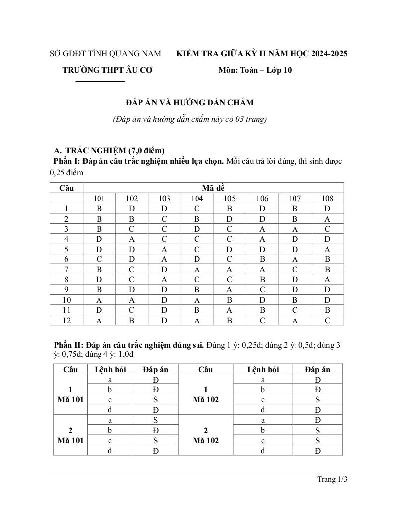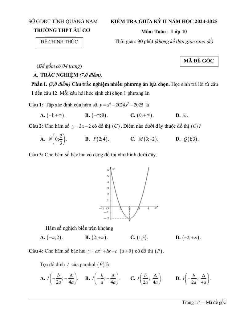 Giải Toán đề giữa kỳ 2 toán 10 năm 2024 – 2025 trường thpt âu cơ – quảng nam với Đáp Án Mới Nhất