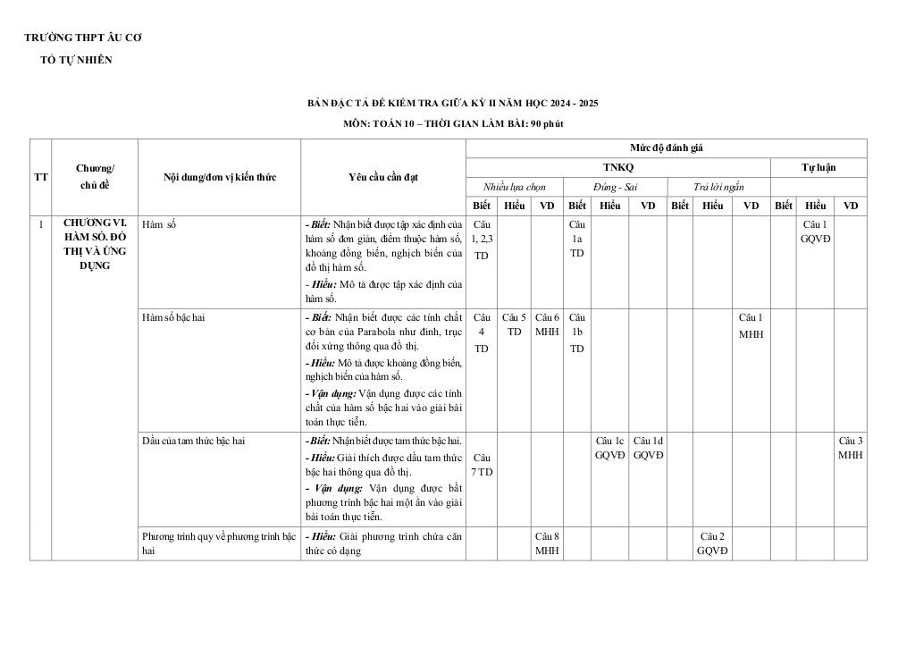 giaitoan.edu.vn giới thiệu đến quý thầy, cô giáo và các em học sinh đề kiểm tra giữa học kỳ 2 môn Toán 10 năm học 2024 – 2025 trường THPT Âu Cơ, tỉnh Quảng Nam. Đề thi có đáp án và hướng dẫn chấm điểm.