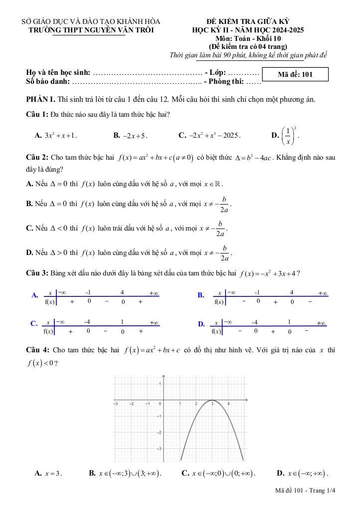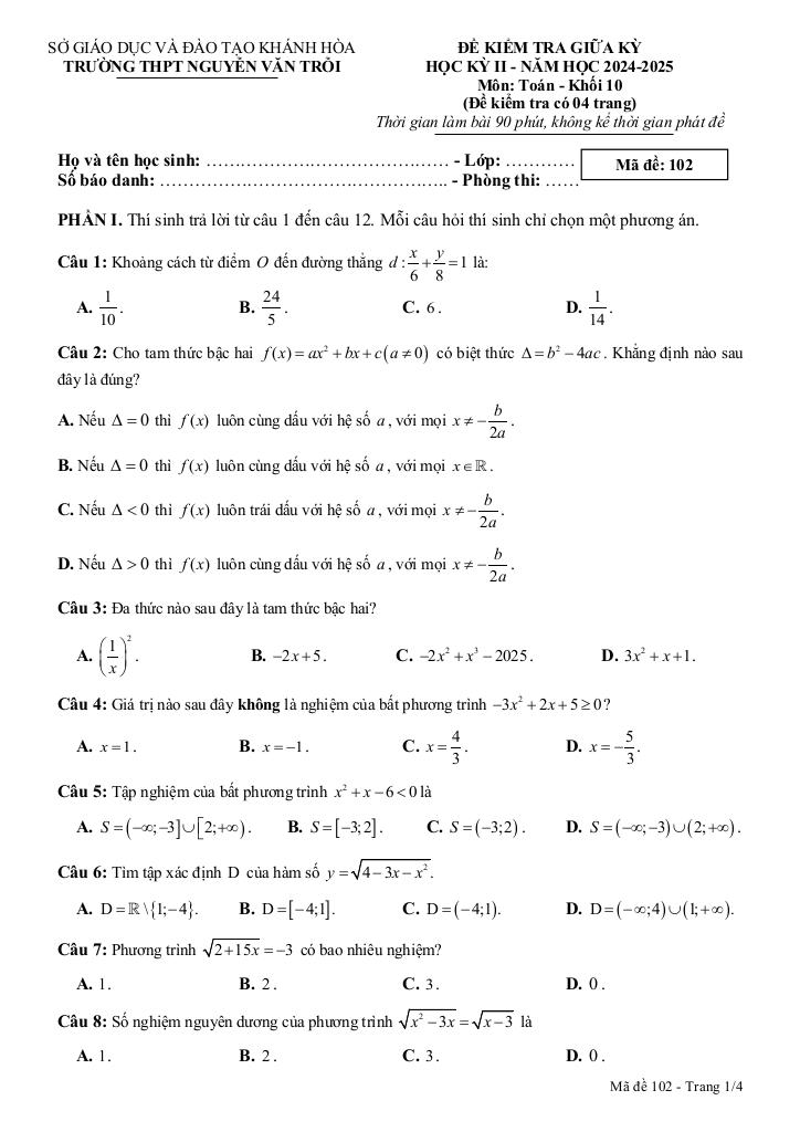 Trích dẫn Đề giữa kỳ 2 Toán 10 năm 2024 – 2025 trường THPT Nguyễn Văn Trỗi – Khánh Hòa: