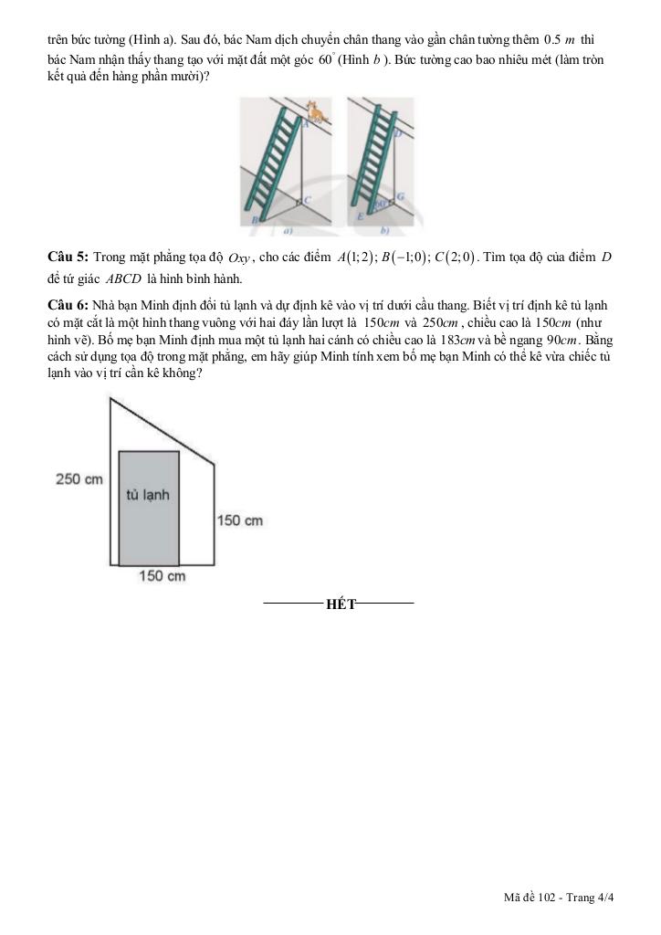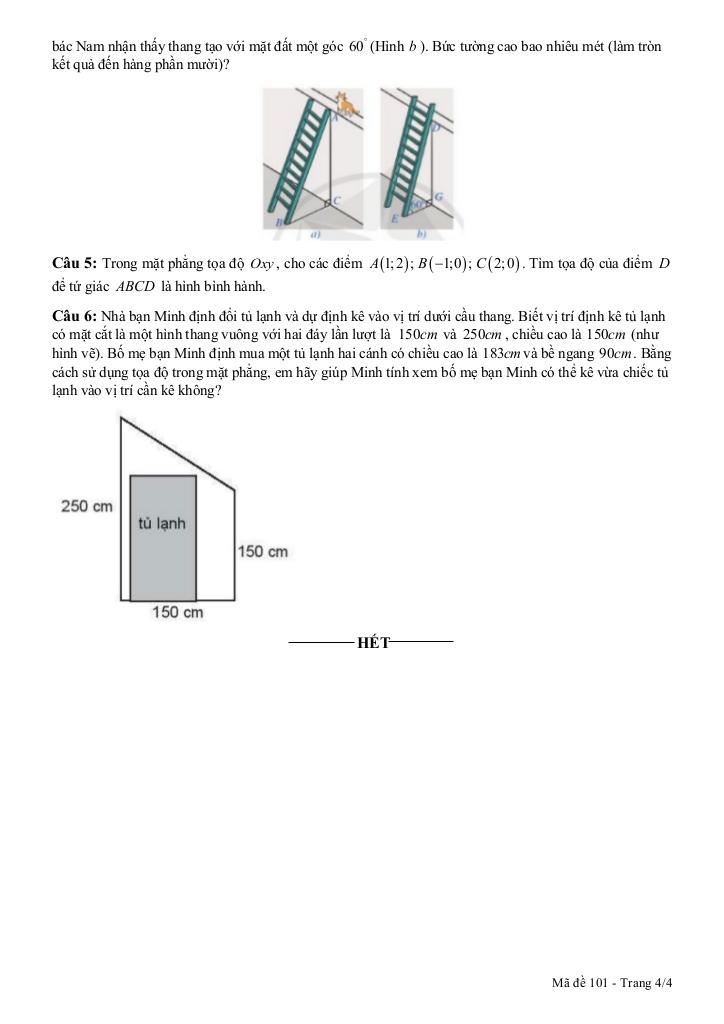 + Nhà bạn Minh định đổi tủ lạnh và dự định kê vào vị trí dưới cầu thang. Biết vị trí định kê tủ lạnh có mặt cắt là một hình thang vuông với hai đáy lần lượt là 150cm và 250cm, chiều cao là 150cm (như hình vẽ). Bố mẹ bạn Minh định mua một tủ lạnh hai cánh có chiều cao là 183cm và bề ngang 90cm. Bằng cách sử dụng tọa độ trong mặt phẳng, em hãy giúp Minh tính xem bố mẹ bạn Minh có thể kê vừa chiếc tủ lạnh vào vị trí cần kê không?