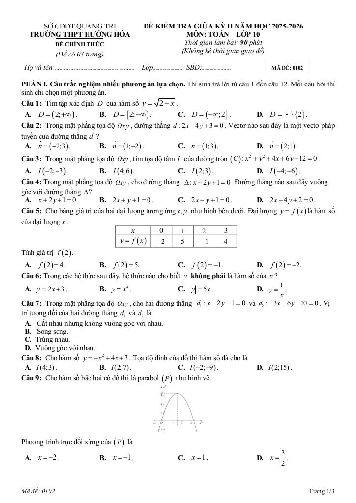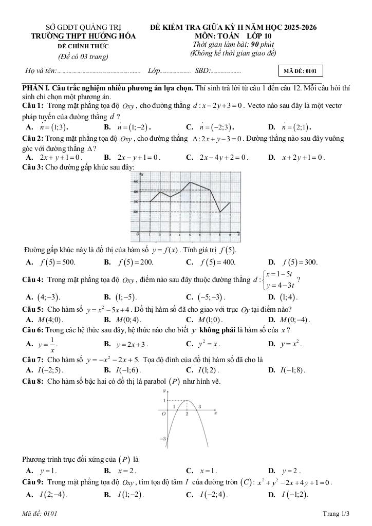 Trích dẫn Đề giữa kỳ 2 Toán 10 năm 2025 – 2026 trường THPT Hướng Hóa – Quảng Trị: