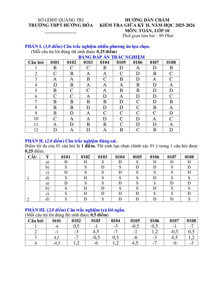 giaitoan.edu.vn giới thiệu đến quý thầy, cô giáo và các em học sinh đề kiểm tra giữa học kỳ 2 môn Toán 10 năm học 2025 – 2026 trường THPT Hướng Hóa, tỉnh Quảng Trị. Đề thi gồm 12 câu trắc nghiệm nhiều phương án lựa chọn + 02 câu trắc nghiệm đúng sai + 04 câu trắc nghiệm trả lời ngắn + 06 câu tự luận, thời gian làm bài 90 phút, có đáp án và hướng dẫn chấm điểm.