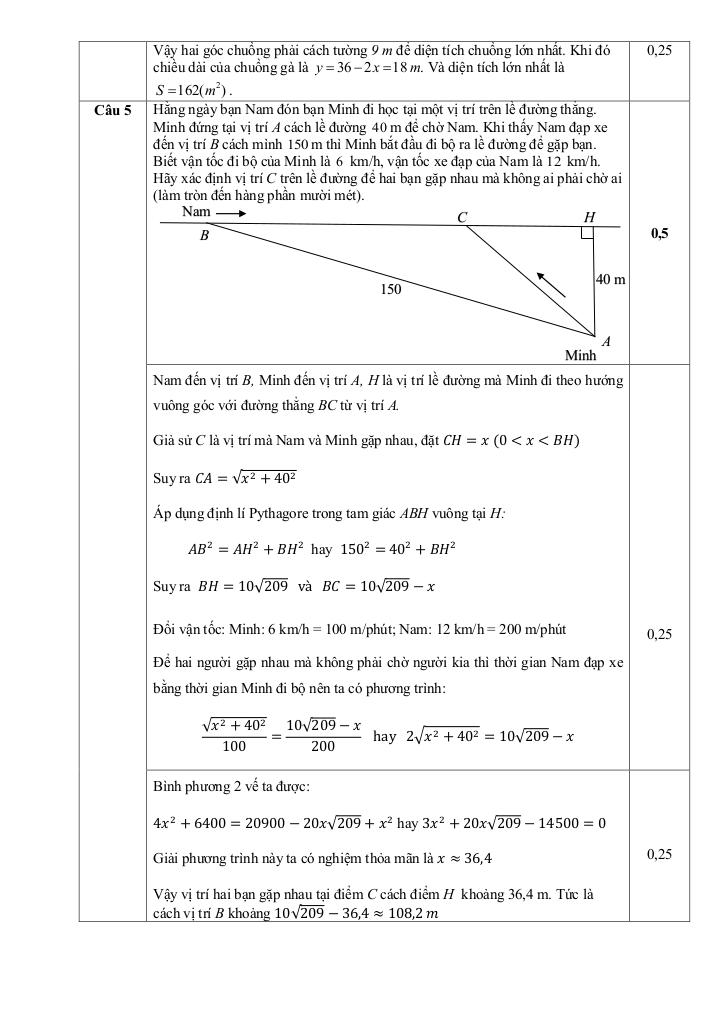 + Hằng ngày bạn Nam đón bạn Minh đi học tại một vị trí trên lề đường thẳng. Minh đứng tại vị trí A cách lề đường 40 m để chờ Nam. Khi thấy Nam đạp xe đến vị trí B cách mình 150 m thì Minh bắt đầu đi bộ ra lề đường để gặp bạn. Biết vận tốc đi bộ của Minh là 6 km/h, vận tốc xe đạp của Nam là 12 km/h. Hãy xác định vị trí C trên lề đường để hai bạn gặp nhau mà không ai phải chờ ai (làm tròn đến hàng phần mười mét).