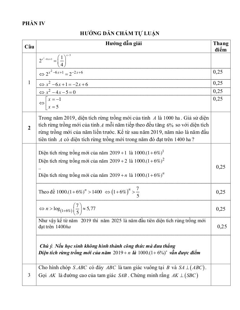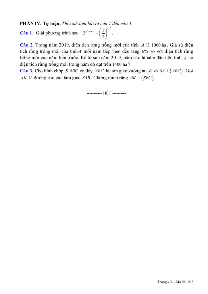 + Trong năm 2019, diện tích rừng trồng mới của tỉnh A là 1000 ha. Giả sử diện tích rừng trồng mới của tỉnh A mỗi năm tiếp theo đều tăng 6% so với diện tích rừng trồng mới của năm liền trước. Kể từ sau năm 2019, năm nào là năm đầu tiên tỉnh A có diện tích rừng trồng mới trong năm đó đạt trên 1400 ha?