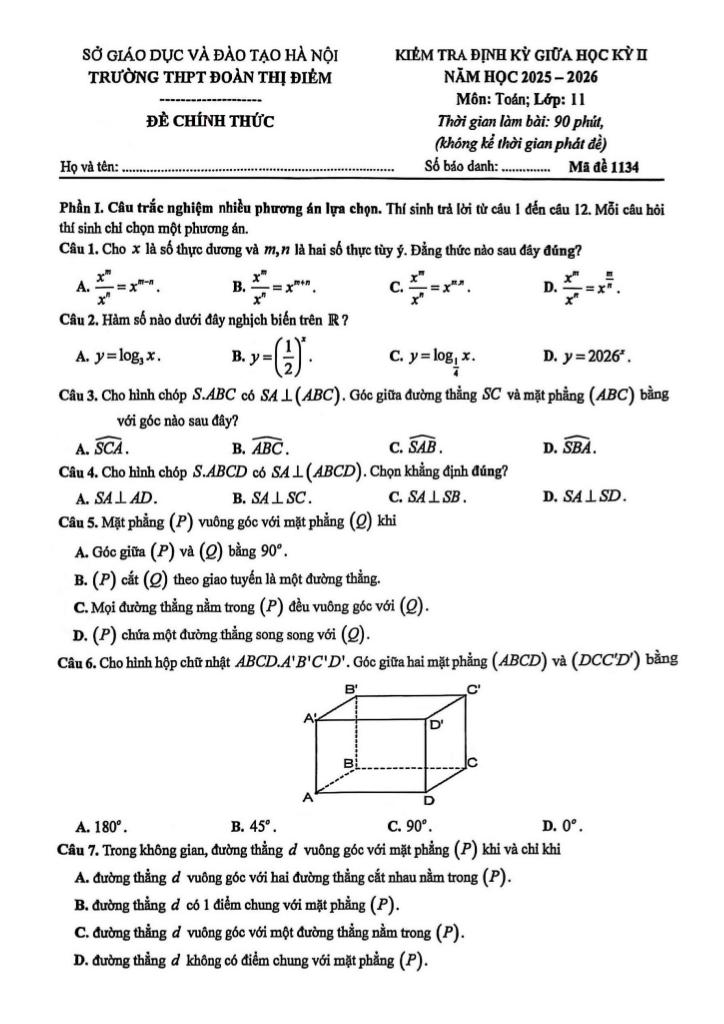 Giải Toán đề giữa kỳ 2 toán 11 năm 2025 – 2026 trường thpt đoàn thị điểm – hà nội với Đáp Án Mới Nhất