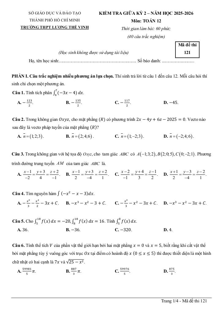 Trích dẫn Đề giữa kỳ 2 Toán 12 năm 2025 – 2026 trường THPT Lương Thế Vinh – TP HCM: