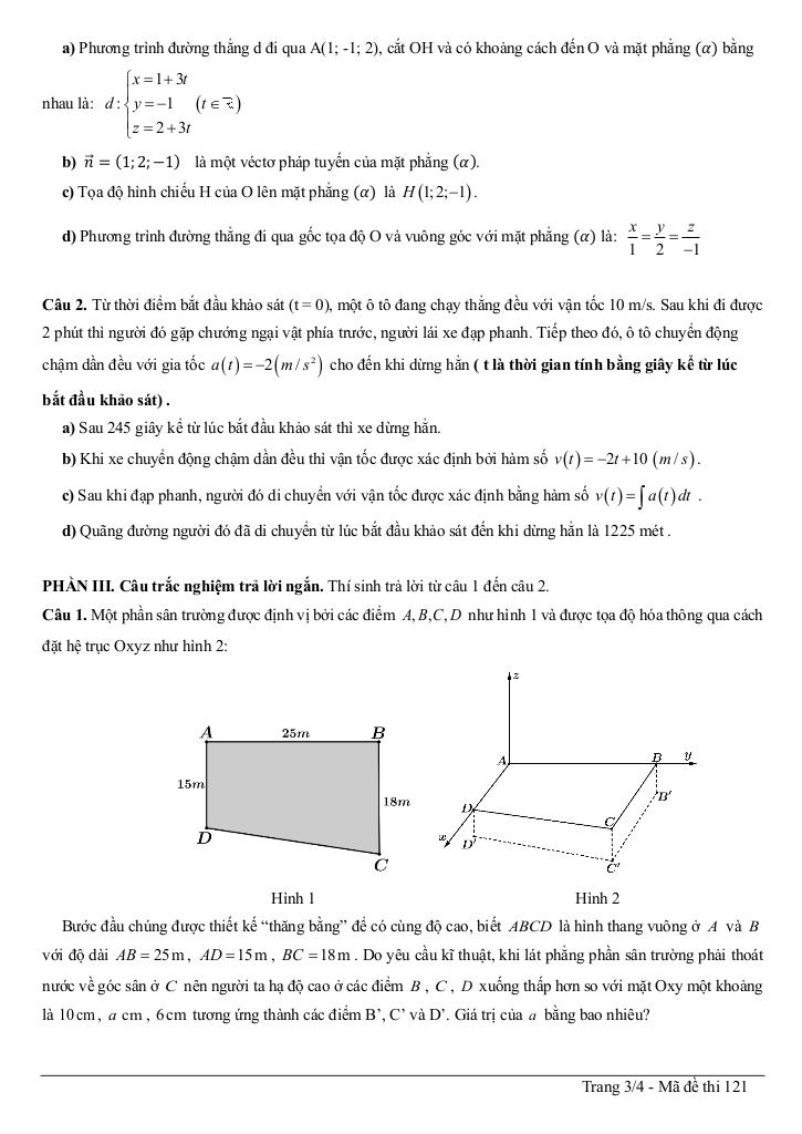 + Một phần sân trường được định vị bởi các điểm A, B, C, D như hình 1 và được tọa độ hóa thông qua cách đặt hệ trục Oxyz như hình 2. Bước đầu chúng được thiết kế “thăng bằng” để có cùng độ cao, biết ABCD là hình thang vuông ở A và B với độ dài AB = 25m, AD = 15m, BC = 18m. Do yêu cầu kĩ thuật, khi lát phẳng phần sân trường phải thoát nước về góc sân ở C nên người ta hạ độ cao ở các điểm B, C, D xuống thấp hơn so với mặt Oxy một khoảng là 10 cm, a cm, 6 cm tương ứng thành các điểm B’, C’ và D’. Giá trị của a bằng bao nhiêu?